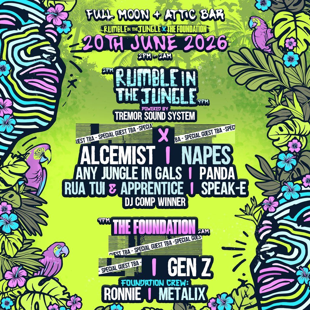 Rumble in the Jungle are back with The Foundation for an all day and night yard party at The Full Moon with Alcemist, Napes, Special Guests & More!Music Genres : UK Garage, Drum and Bass, Jungle