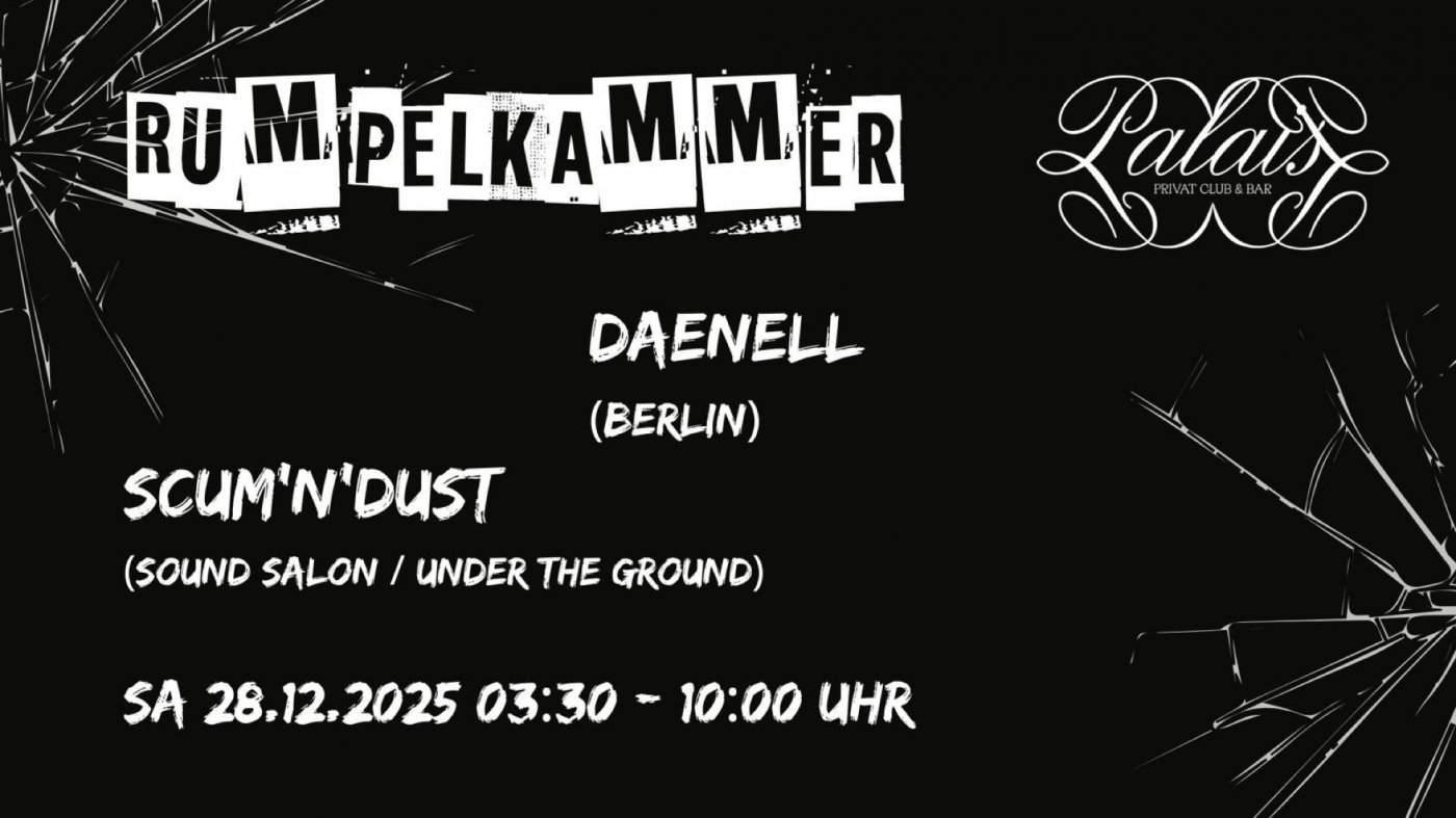 Kurz vor Jahresende lässt es das Rumpelkammer-Musikensemble bei uns noch mal ordentlich krachen. Dazu jettet eigens Daniel aka Daenell aus Berlin in den tiefen Süden. Er ist eigentlich hauptamtlicher Barchef im Berliner Sisyphos Club, doch manchmal juckt es ihn in den Fingern und er mixt dort statt kühler Cocktails lieber heißen Sound zusammen. Was die Sisyphos-Arbeit angeht, fährt er also zweigleisig. Und auch wir lassen ihn heute lieber hinterm DJ-Pult als hinter der Theke werkeln. Tatkräftige Unterstützung erhält er vom Duo Scum’n’Dust. Die beiden Rumpelkammer-Entdecker sind bekannt für ihre kreative und ausgelassene b2b-Performance hinter den Decks. Im Oberdeck der Musikgenres befinden sich bei ihnen Indie-Dance, Techhouse der hochenergetischen Art und Rolling-Bass-Techno. Eine wunderbare Mischung, um unsere Kammer zum Rumpeln zu bringen.