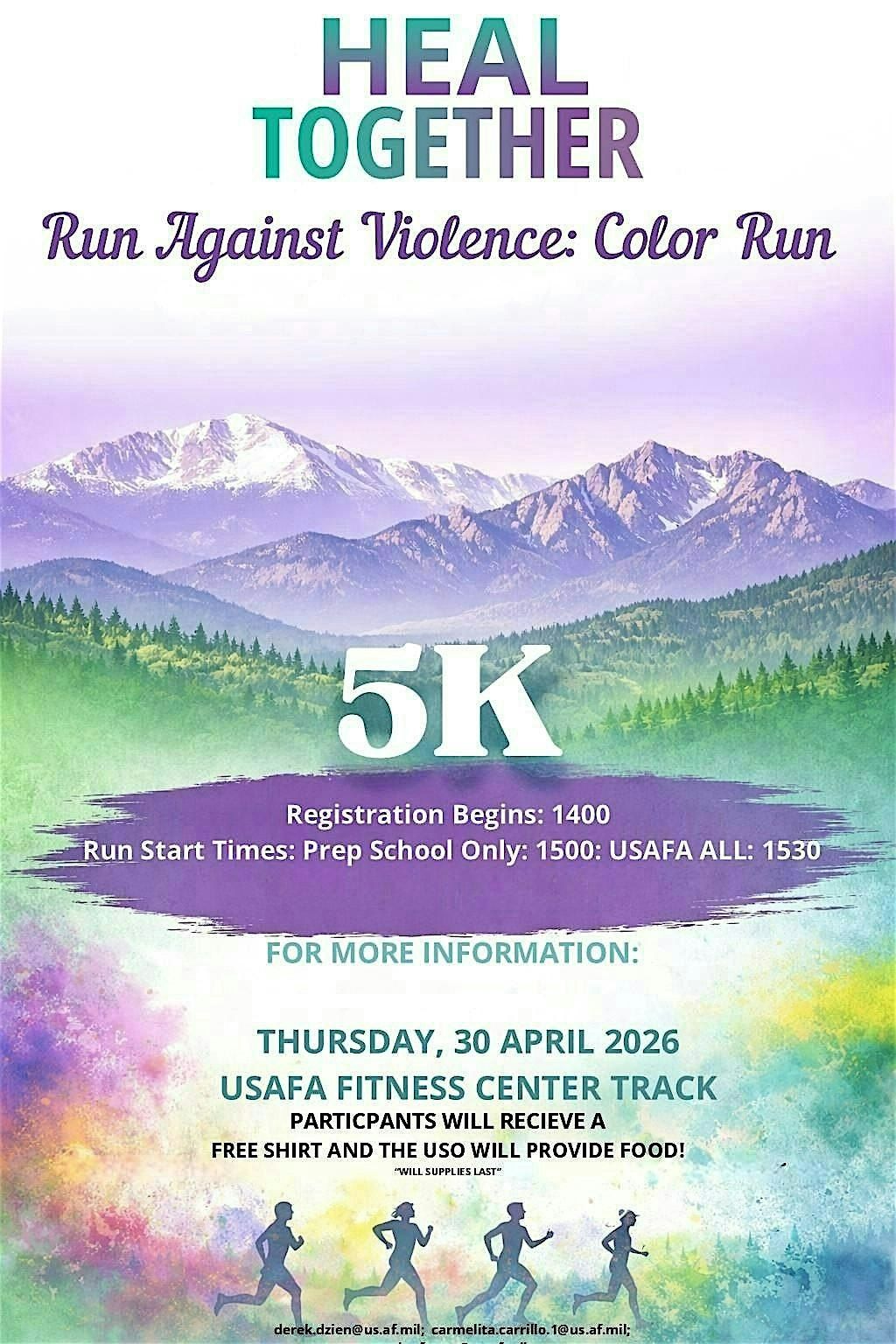 Registration starts at 1400 . The Prep School Run begins at 3:00 PM, followed USAFA ALL at 1530 . Food vendors will be on-site, and runners will receive a free t-shirt while supplies last!