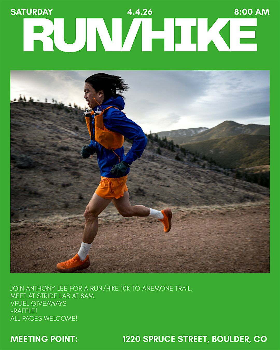 Run/Hike 10k to Anemone Trail. All levels welcome! Meet at Stride Lab (1220 Spruce St, Boulder) at 8am.