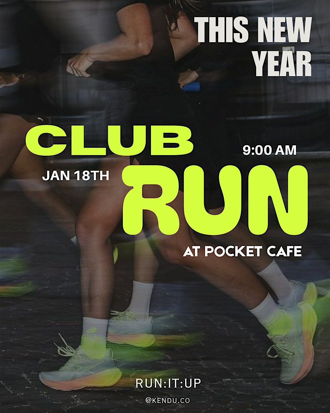 Join Run:It:Up for a relaxed 5K run, starting and ending at Pocket Café, followed by free coffee + post-run chats ☕✨