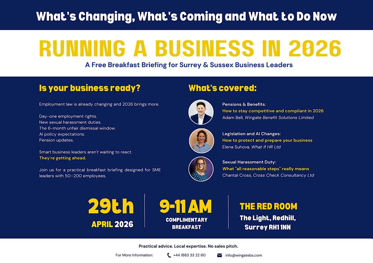Get ready to dive into what's changing, what's coming, and most importantly, what to do now to keep your business ahead of the game. Join us in person for a laid-back session packed with fresh insights and practical tips. Whether you're a business owner in need of support or a seasoned HR professional, this event will equip you with the tools and knowledge to thrive in 2026 and beyond. Don't miss out!