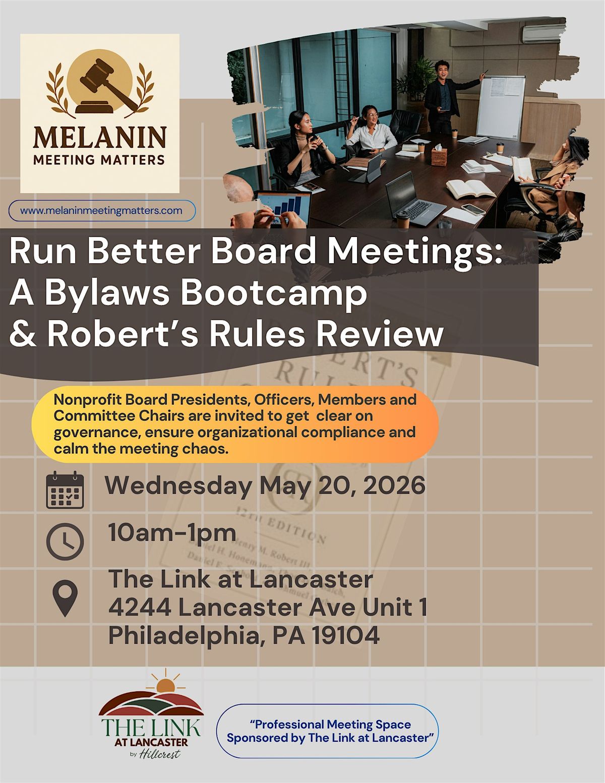 Join us on May 20, 2026 at 10:00 AM (Eastern Time) for a fun and practical session at 4244 Lancaster Ave unit 1. We'll dive into how to run smoother board meetings by mastering your bylaws and brushing up on Robert's Rules. Whether you're new or just need a refresher, this bootcamp will make meetings less stressful and way more effective. Come ready to learn and chat!