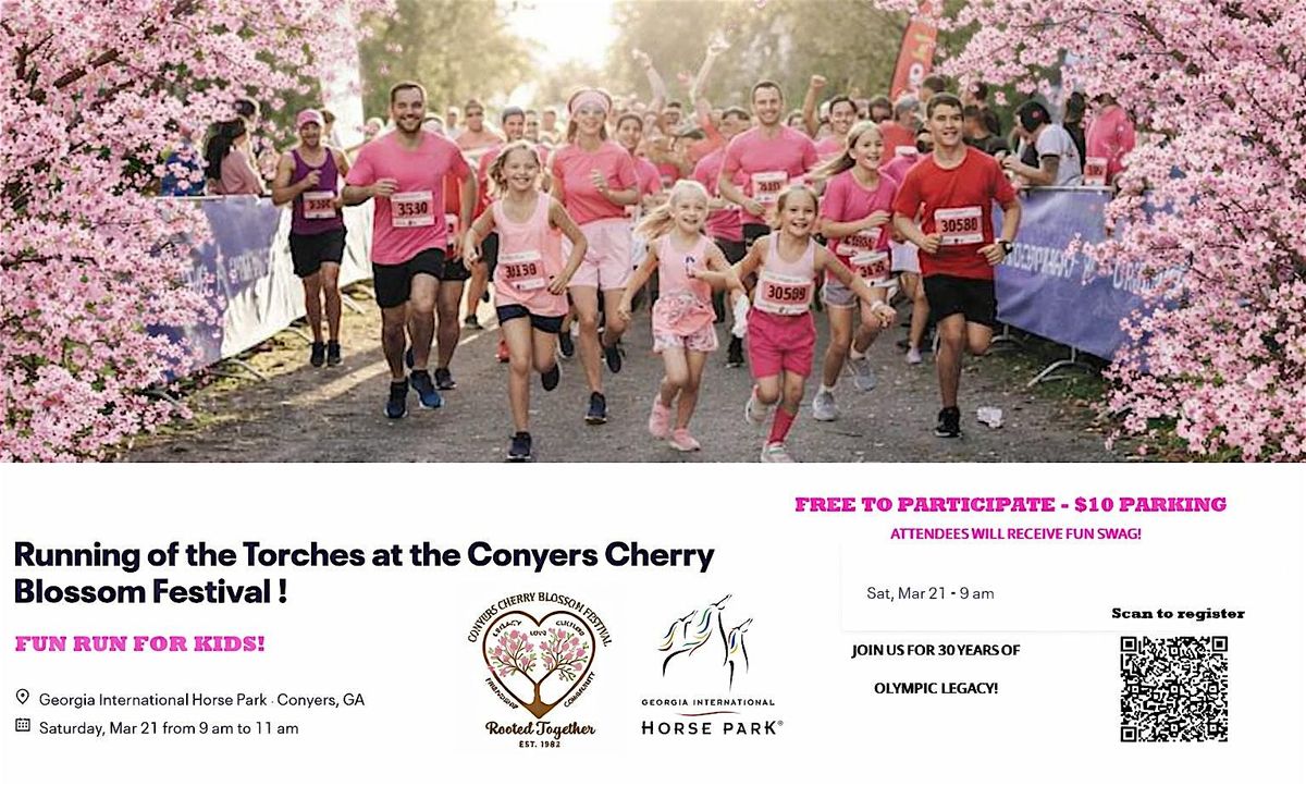 Join us Saturday, March 21 at 9:00 a.m. as we launch the 45th Annual Conyers Cherry Blossom Festival with the Running of the Torches — a high-energy, feel-good ceremonial fun run celebrating 30 years of Olympic history at the legendary Georgia International Horse Park.
