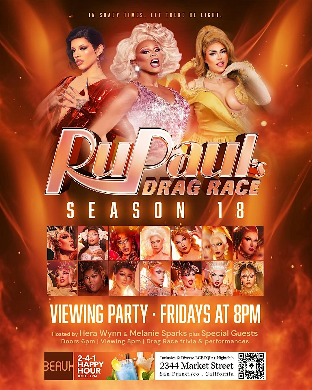 Ready to sashay and slay? Join us at Beaux for a fabulous night watching Rupaul's Drag Race at Beaux in the heart of the Castro. Catch the latest drama, fierce lip-syncs, and celebrate all things drag with hostesses Melanie Sparks and Hera Wynn. Bring your besties and let's get sickening!