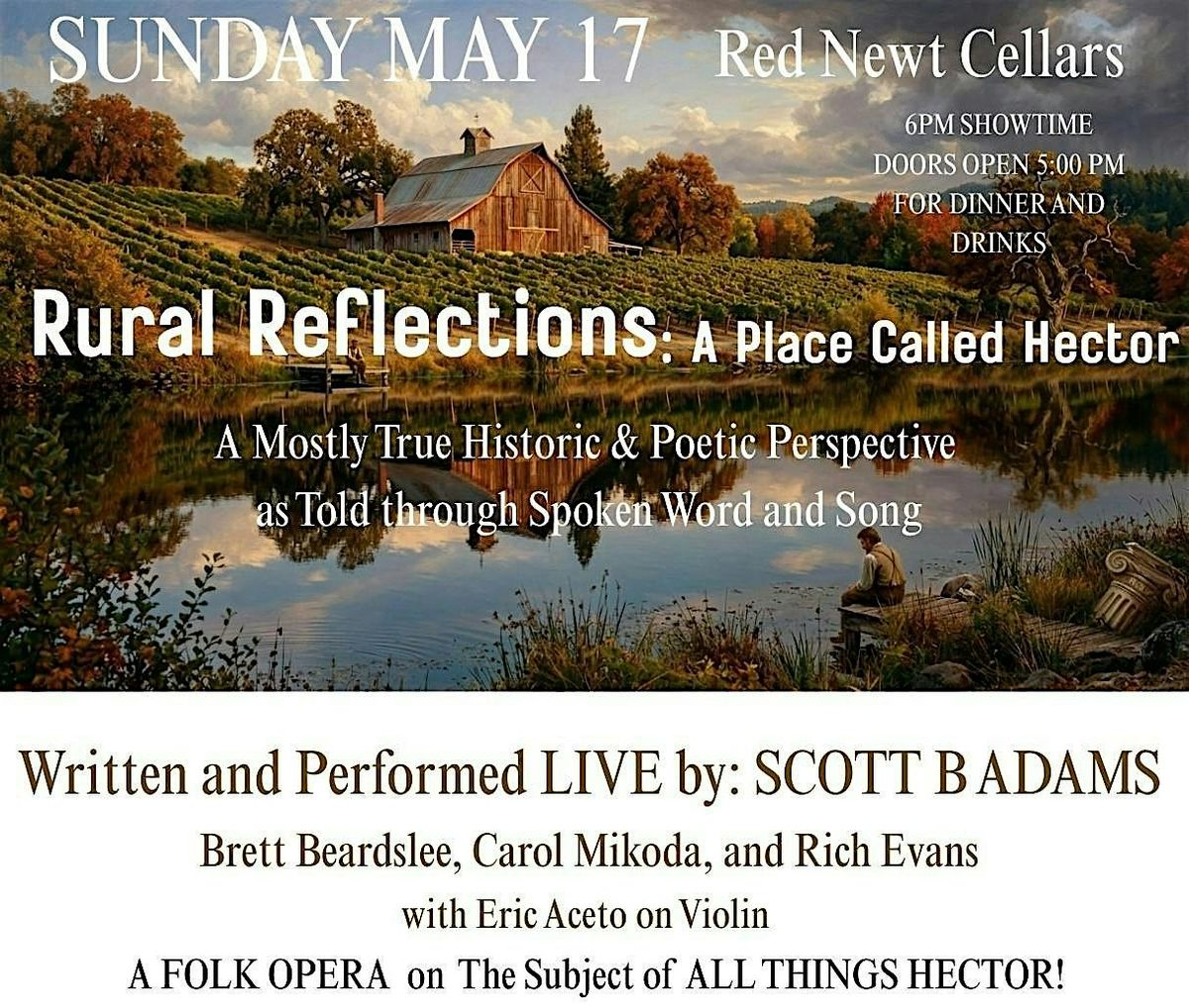 In the tradition of American folklore, join us on a journey through the past and future of Hector, NY, a place where fact and fiction blur. This place of breathtaking landscapes and lake-scapes is REFLECTED IN MUSIC, SONGS, and POETRY. Hear the STORIES of Hector, a place where beloved characters—rugged farmers; dedicated artists, musicians, and wine-makers; culinary innovators; hard-working women and men; brave firemen; community-minded church members; way too cute for their own good children; lake-loving bums; barflies; and sailors—manage to co-exist. Hector Musical Artists, under the direction of Scott B. Adams, present this TWO-ACT MUSICAL.