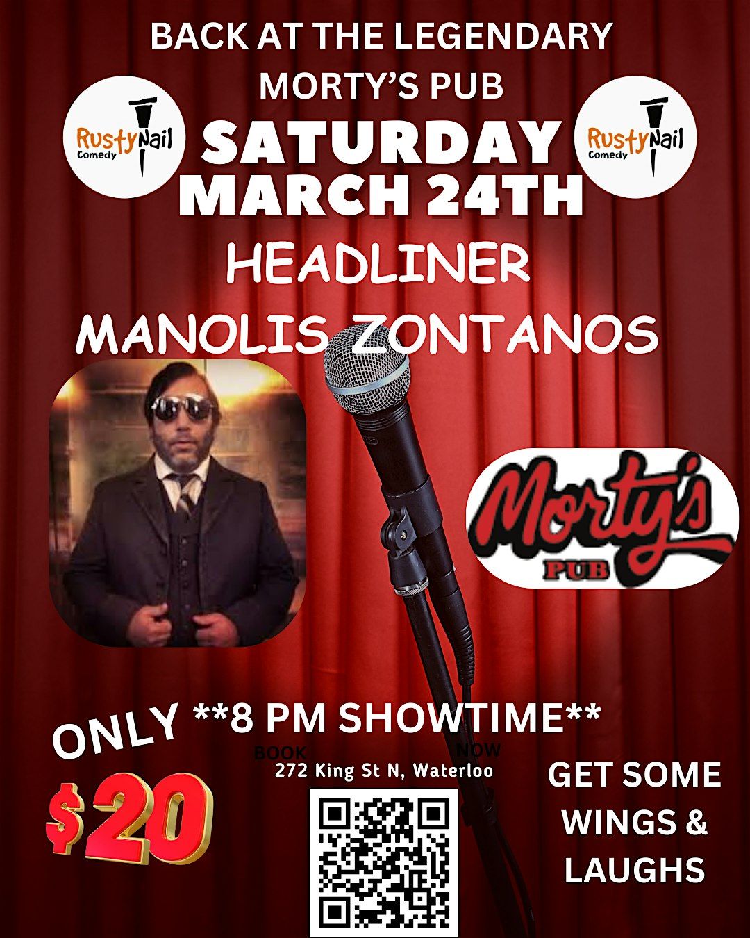 Join us for a night of laughter at Morty's Pub Waterloo! Get ready for a night filled with BIG LAUGHS FROM KW'S PREMIER COMEDY PRODUCER. Grab your friends and enjoy an evening of comedy at its BEST at KW's best wing place. Mark your calendars and get ready to laugh your socks off!
