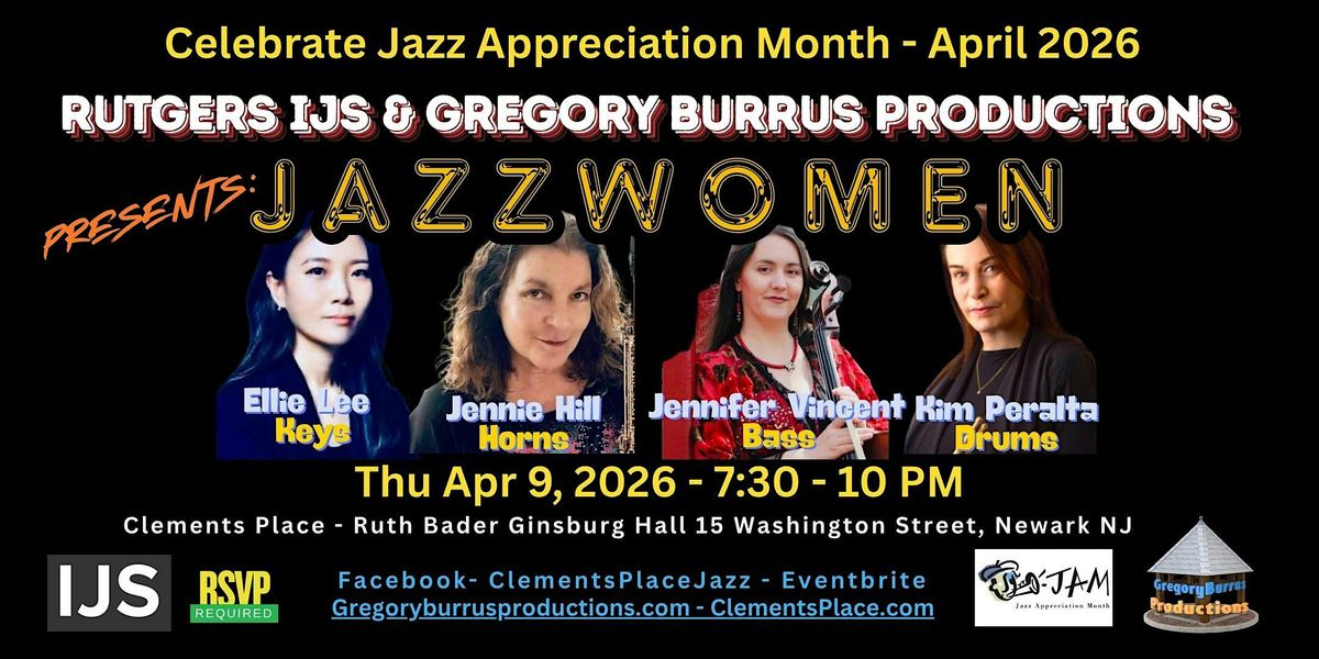 Get ready for an unforgettable night as Rutgers IJS and Greg Burrus present The Jazz Women — a powerhouse ensemble of brilliance, fire, and fearless creativity. Pianist Elle Lee brings her dynamic touch and modern swing, matched by the soulful, hard‑driving horn work of Jennie Hill. Holding down the groove with deep pocket and rhythmic command is drummer Kim Peralta, while bassist Jessica Vincent anchors the band with warmth, strength, and unstoppable momentum. Together, these four extraordinary artists deliver a bold, high‑energy celebration of women who are shaping the sound and future of jazz.