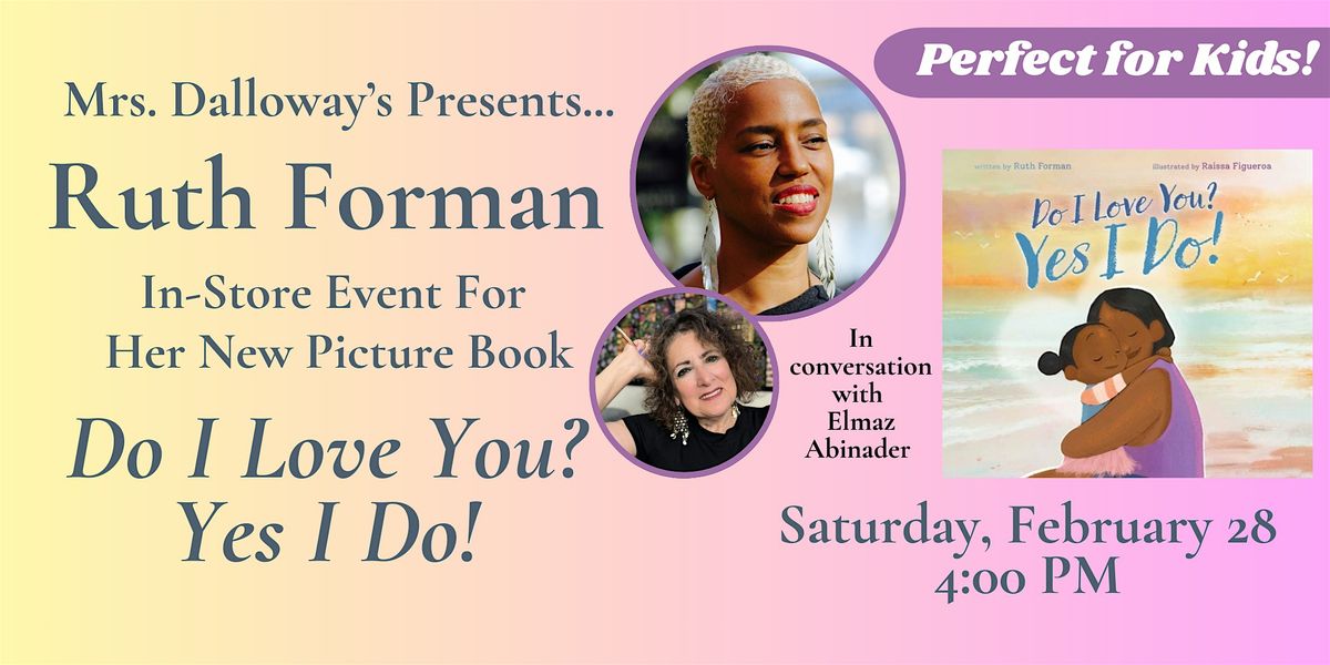 Welcome to Ruth Forman's DO I LOVE YOU? YES I DO! In-Store Event And Signing For Kids happening at Mrs Dalloway's on February 28, 2026 at 4:00 PM (Pacific Time). Join us for an afternoon of fun and storytelling with the talented Ruth Forman. Bring your little ones along for an exciting adventure as Ruth reads from her latest book. Don't miss the chance to meet the author in person and get your copy signed! See you there!