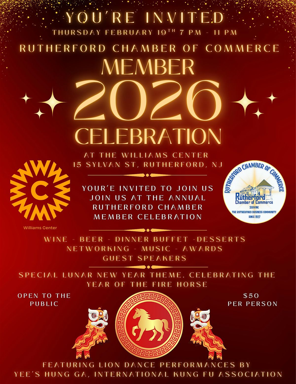 The Rutherford Chamber of Commerce is excited to celebrate its members at our Annual Member Celebration. Happening at the Williams Center in Rutherford. Attendees will enjoy a buffet dinner, wine, beer, desserts, member awards, & guest speakers. This year will have a special theme to celebrate the Lunar New Year (Year of the Fire Horse) featuring authentic lion dance performances by "Yee's Hung Ga, International Kung Fu Association.