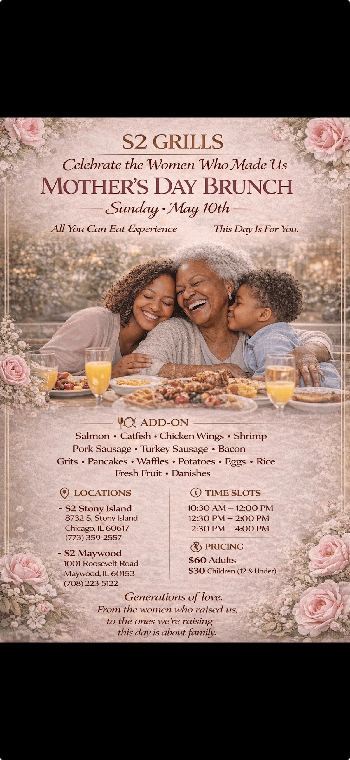 Join us @S2 Grills for a special All You Can Eat Mother’s Day Brunch Experience designed to bring families together over great food and love
