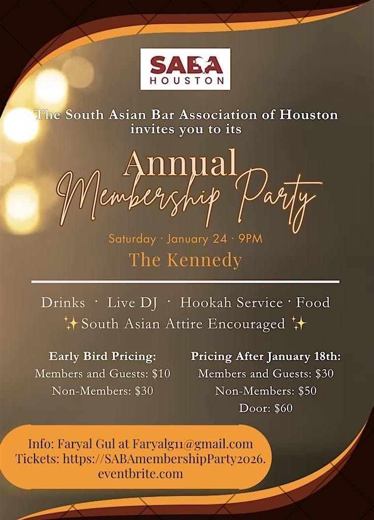 The South Asian Bar Association of Houston invites you to its Annual Membership Party, an exciting night of music, networking, and celebration.