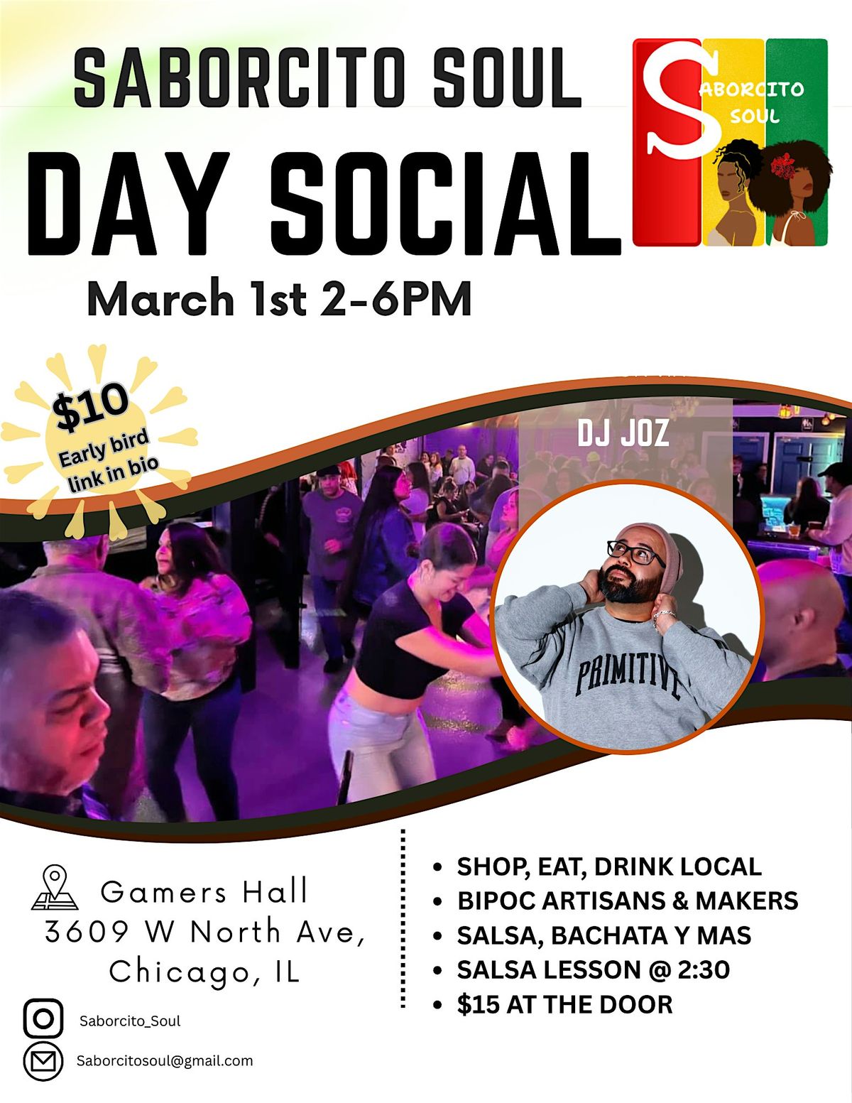 Come join Saborcito Soul for an afternoon filled with social dancing, great food, and amazing small business finds at Gamer's Hall! Our March edition of Saborcito Soul Day Social & Market will explore beautiful crafts, delicious food, and social dancing with Chicago's very own, DJ JoZ! Support local, get your dance on while still being in bed by 8pm! Don't forget the FREE dance workshop at 2:30p, all levels are welcome!