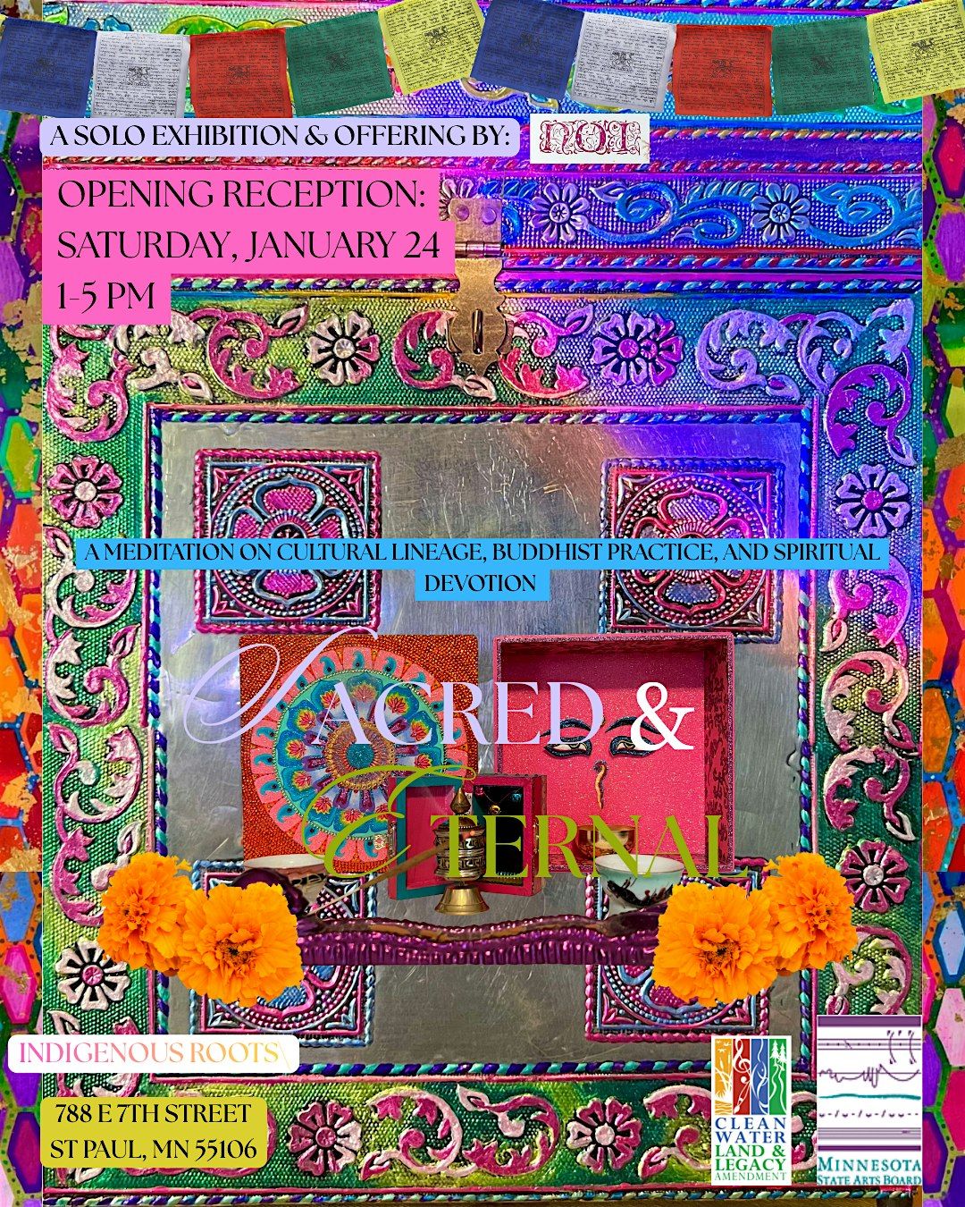 Sacred & Eternal is a meditative instillation that invites the visitors to pause, breathe, and engage in spiritual play. Drawing from Buddhist practices accross Therevāda, Tibetan, and Zen lineages, as well as reflections from the artist's Lao roots. The exhibition is expressed through original artworks, devotional forms, ritual objects, and nostalgic memory.