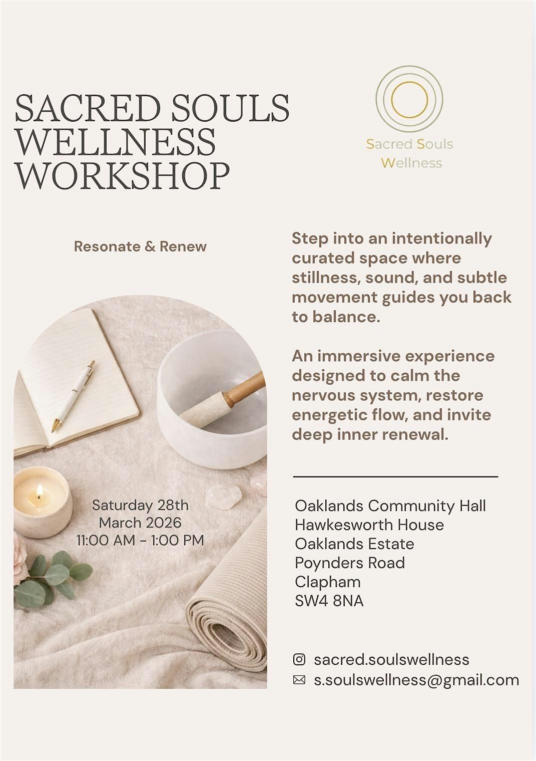 Join us in person for the Sacred Souls Wellness Workshop, a welcoming space designed to help you relax, reconnect, and recharge. This uplifting experience invites you to slow down, nurture your wellbeing, and connect with a community of like-minded souls.
