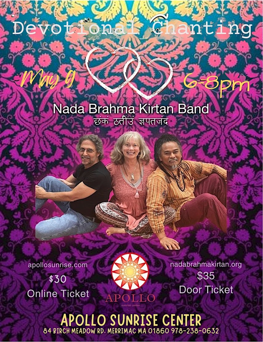 Nada Brahma Kirtan is currently a three member band founded by Kāmpa Vashi Deva and Lisa Kawski in 2018. The band originated on the North Shore and from the west of Boston. They bring their instruments and voices together to share with the community their devotion, invoking the healing light of the Universe. Tapping into the experience opens your heart and mind, helping to bring peace to the planet and beyond.