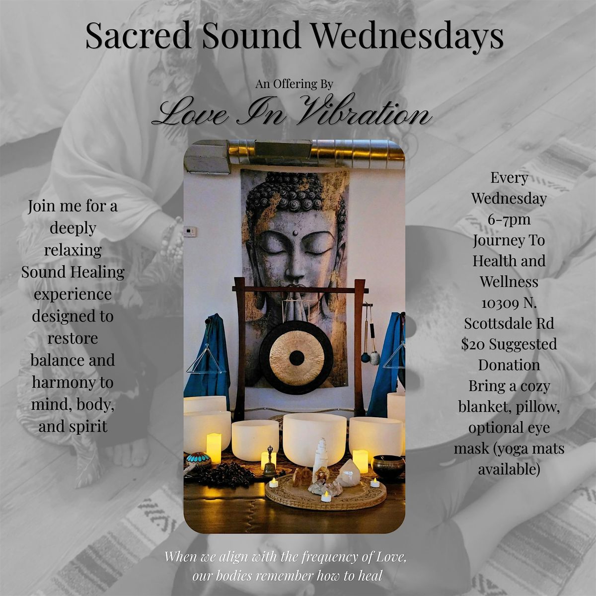 Join me each week in a tranquil and supportive environment where you can unwind and gently release the stresses of daily life. This immersive sound healing experience features the resonant tones of crystal singing bowls, gongs, and other soothing instruments, guiding you into deep relaxation and inner stillness. As the vibrations move through you, they help quiet the mind, ease tension in the body, and create space for emotional and energetic renewal. Held weekly, this gathering offers a sacred pause in the middle of your week—a time to nurture yourself, reconnect with your inner wisdom, and simply receive.