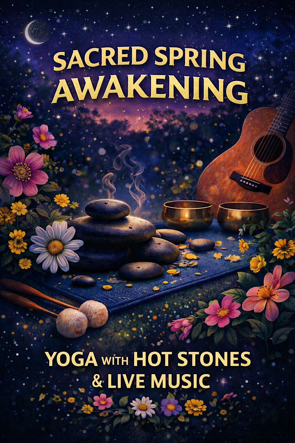 Through deeply restful restorative yoga, the grounding warmth of hot stones, and an immersive live soundscape, you’ll be guided into profound relaxation and renewal. This is a space to soften what winter has held, to soothe the nervous system, and to awaken slowly into the warmth and promise of spring.