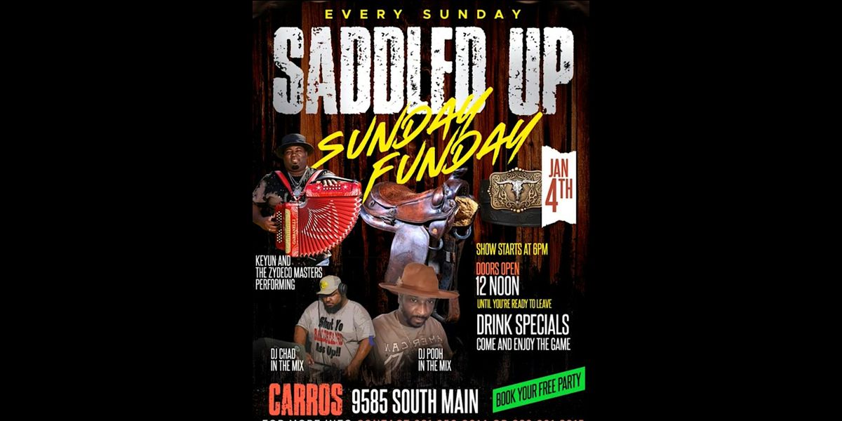 Jan 4th! Saddle Up Sunday Funday at Carros! Keyun & The Zydeco Masters, DJ Pooh, DJ Chad, & drink specials. Doors open 12PM. Don't miss it!