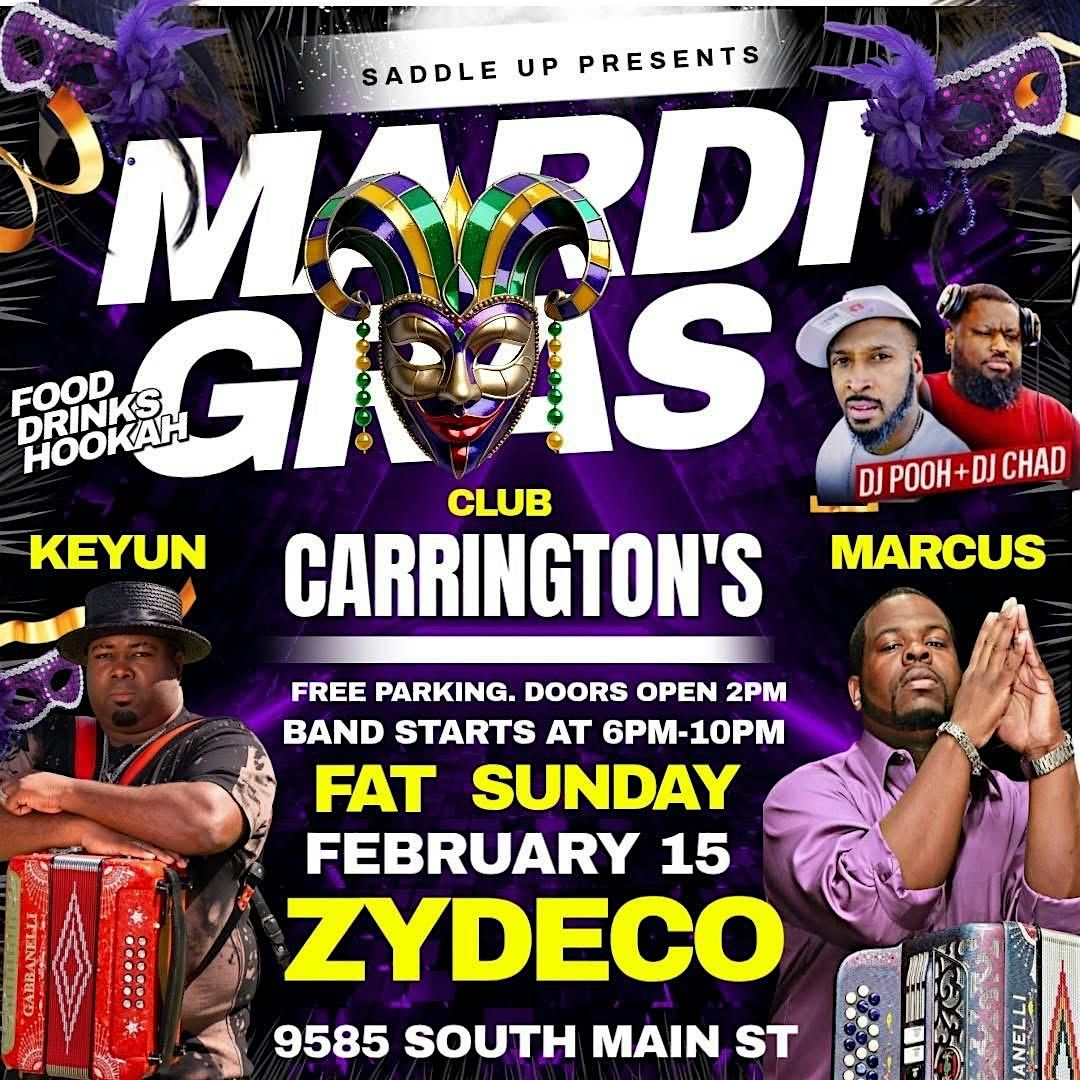 Mardi Gras Zydeco Sunday! Live Zydeco band, DJs, food, drinks & hookah at Carrington's Sports Bar! Contact (281) 250-8014 or (832) 291-8915About this Event
