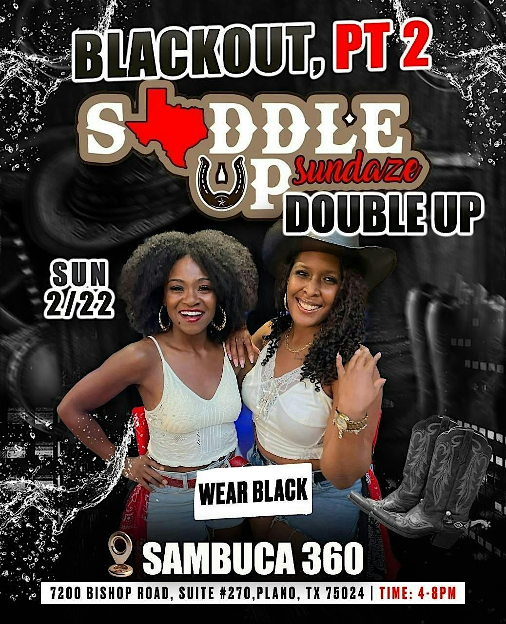 We’re doubling back by popular demand. 2/22 calls for a Double Up, so we’re bringing Black Out Part 2 to the dance floor for another night of high-energy Saddle Up Sundaze vibes.