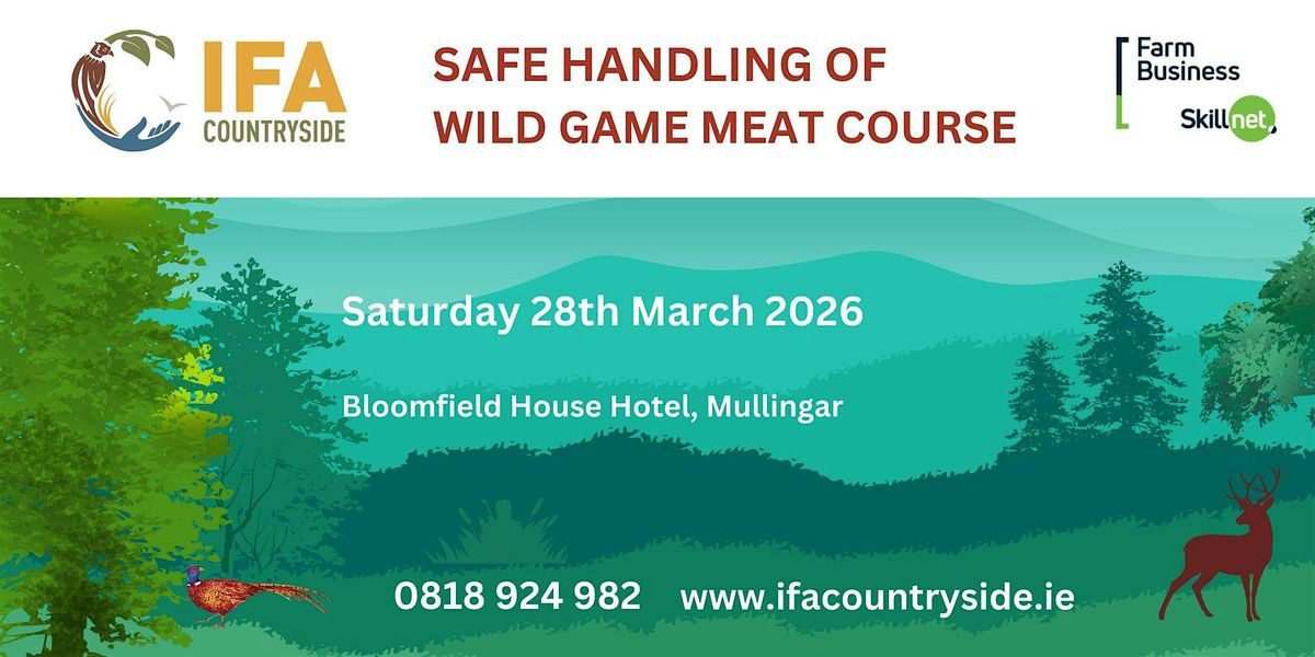 Join us for the first in the 2026 Series of Safe Handling of Wild Game Meat Courses on Saturday, 28th March 2026, at Bloomfield House Hotel, Mullinar. This in-person event will provide valuable insights into the safe handling of wild game meat. Starting at 08:30 AM , the event aims to educate and inform participants about the proper techniques and precautions involved in handling wild game meat. Refreshments and Lunch provided.
