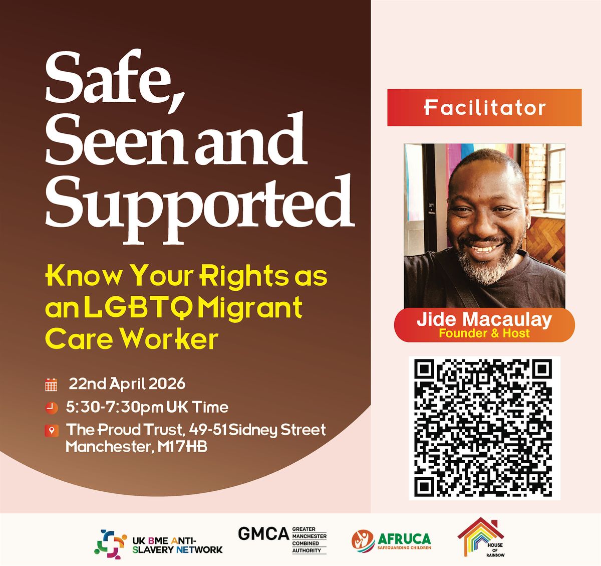 This empowering training webinar helps LGBTQ and migrant care workers in Greater Manchester understand their rights, recognise exploitation, and access safe support. It explains how Certificate of Sponsorship visas work, how abuse and unfair treatment can happen, and what to do if pay, hours, housing, or immigration status are used to control you. Participants learn how to spot warning signs, protect their dignity at work, and connect with trusted GMCA and BASNET support pathways. Rooted in community care and long standing values of fairness and justice, this session reminds every worker that seeking help is a strength and that no one should face exploitation alone.
