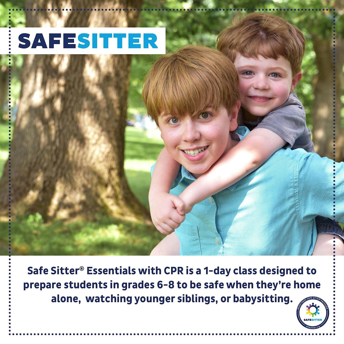 Safe Sitter® is designed to prepare students in (or entering) grades 6-8 to be safe when they’re home alone, watching younger siblings, or babysitting. The instructor-led class is filled with fun games and role-playing exercises. Students learn safety, child care, first aid & rescue, and life & business skills.