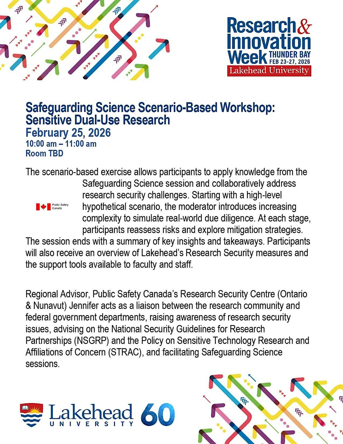 The scenario-based exercise allows participants to apply knowledge from the Safeguarding Science session and collaboratively address research security challenges. Starting with a high-level hypothetical scenario, the moderator introduces increasing complexity to simulate real-world due diligence. At each stage, participants reassess risks and explore mitigation strategies. The session ends with a summary of key insights and takeaways. Participants will also receive an overview of Lakehead’s Research Security measures and the support tools available to faculty and staff.