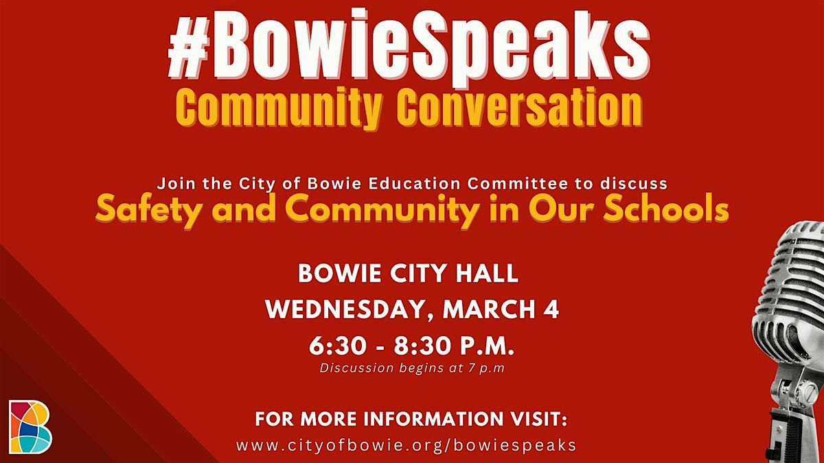 Take part in the next #BowieSpeaks Community Conversation hosted by the City of Bowie Education Committee. Join this community conversation focused on school safety, student well-being, and belonging. This event will explore current challenges facing students, including cyberbullying, mental health, and the impact of social media on school climate.