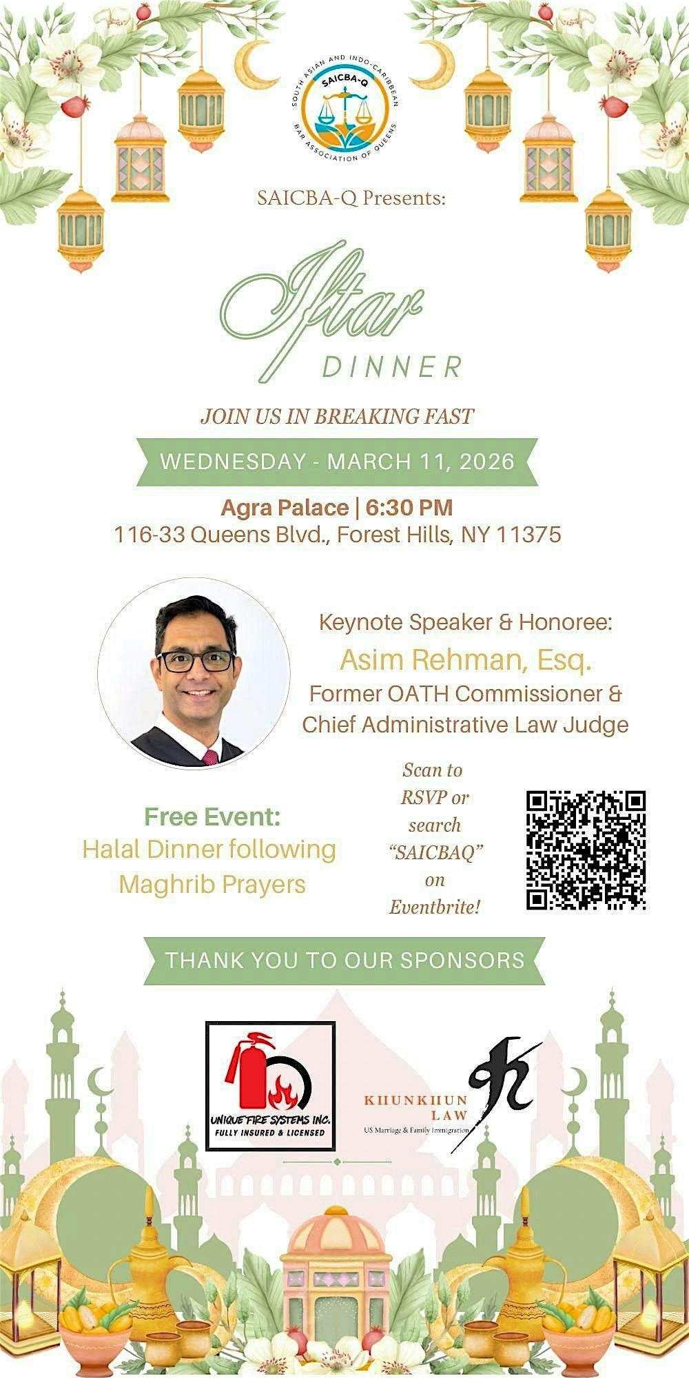 The event will feature keynote speaker and our honoree for the night, Asim Rehman, Esq., former Commissioner and Administrative Law Judge at New York City's Office of Administrative Trials and Hearings (OATH).