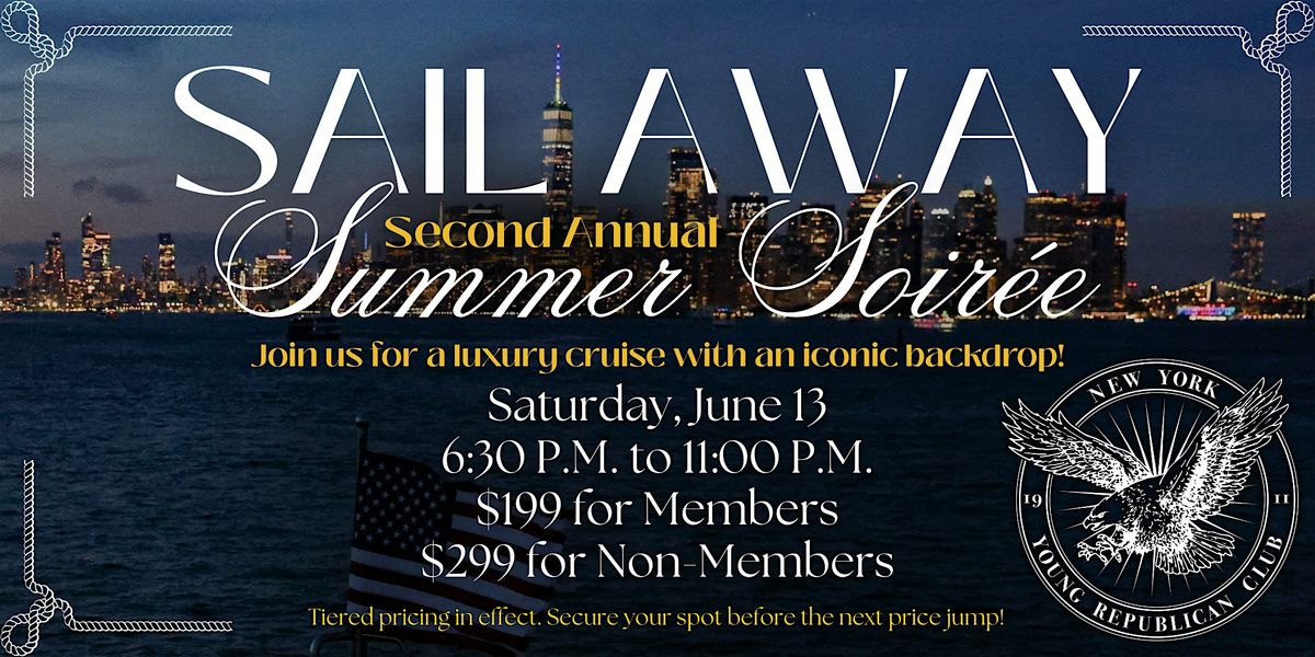 By attending this event, the ticket holder voluntarily assumes all risks and dangers incidental to the event, including but not limited to those arising from being on or around the boat, such as slips, falls, injuries, or accidents due to movement of the boat, weather, water conditions, or actions of other individuals. The ticket holder agrees to release and hold harmless the New York Young Republican Club and its officers and other agents from any and all claims of liability, including for personal injury, death, property damage, or loss, whether caused by negligence or otherwise. Attendance and participation are at the ticket holder's own risk.