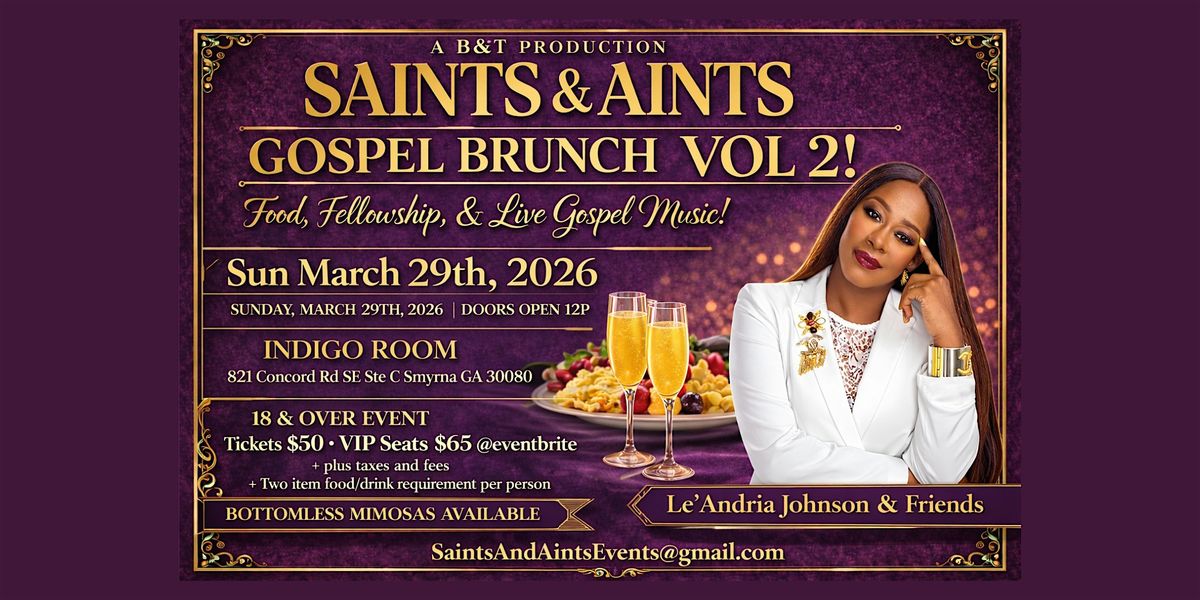 Saint and Aints!! We are back with another event! Join Le'Andria Johnson and Friends for a Praise Break Brunch!! Food, fellowship, and live gospel muisc! Band and Dj!!! Don't miss out!! - see you there!