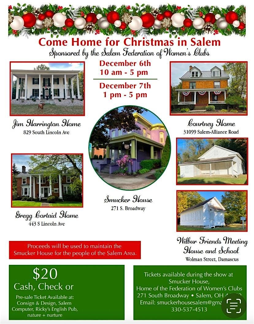 This Christmas home tour begins at The Smucker House-Salem Federation of Women's Clubs at 271 South Broadway, Salem where tickets and pamphlets will be picked up. Then using the map visit the homes in any order you like at your own pace.