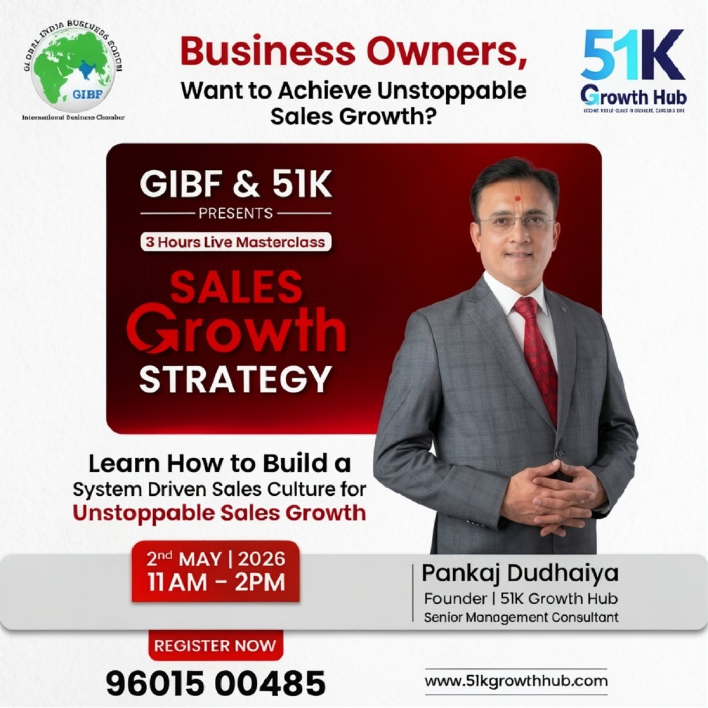 We are delighted to announce the 3 Hours Live Masterclass on Sales Growth Strategy jointly presented by GIBF & 51K Growth Hub and led by Mr. Pankaj Dudhaiya. 🚀