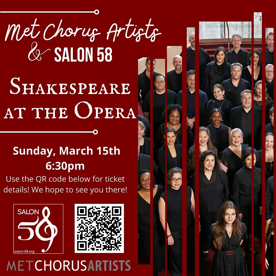Met Chorus Artists return to Salon 58 for a lively evening dedicated to the power and lyricism of Shakespeare! His life and works have been reinvigorated by the Academy Award nominated Hamnet, now come see how the Bard translated into a musical feast by the spectacular Met Chorus Artists! Accompanied by a fabulous concert grand piano, the Met Chorus Artists are proud to present “Shakespeare at the Opera” on the Ides of March!!