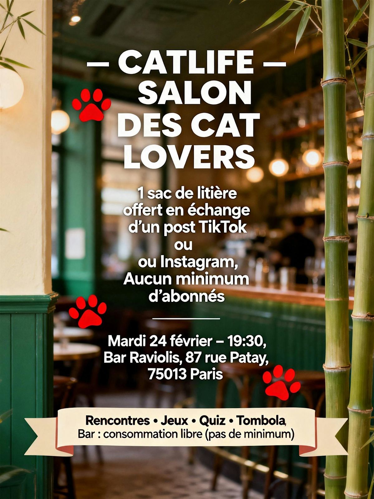 Rencontre entre cat parents à Paris : jeux, quiz, tombola + 1 sac de litière offert (post IG/TikTok). Places limitées.