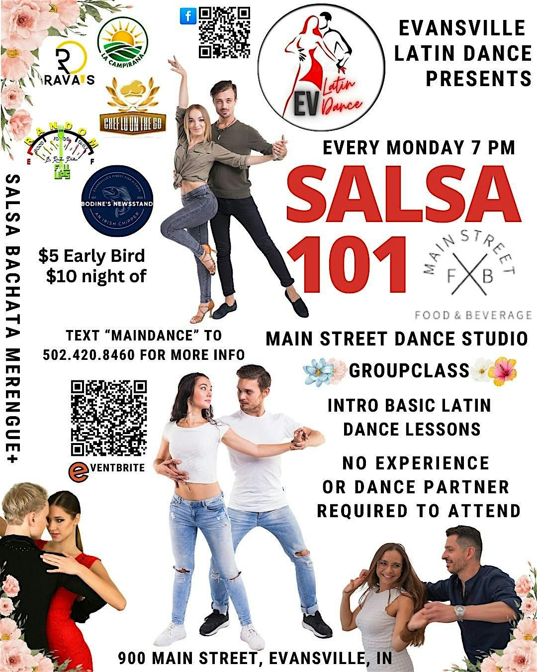 Join us for a fun and energetic evening of Latin dancing at The new Main Street Dance Studio, attached to Main Street Food and Beverage. $5 advance $10 Night of. Cash only.