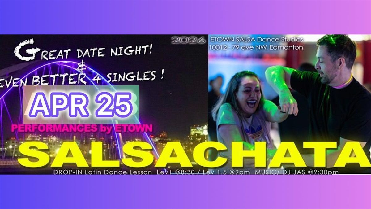 Salsachata is back and we have a treat for all of you. Step into our new studios just off whyte avenue and 99 st and come take our beginner lesson or just come dance! Our motto is " Great date night and even better for singles!" and so this welcomes absolute beginners as well as current students and dance community dancers! In addition, you will enjoy performances by our Salsa and Bachata teams! The lesson starts at 8:30pm and the performances start at 10pm! We also will have 2 rooms to play with a dedicated Salsa room with occasional Cha-chas and a Bachata room with occasional Merengues. The 2 rooms will open up at 10:10pm and prior we will have one room play both genres. For tickets click here: https://etownsalsa.com/events/