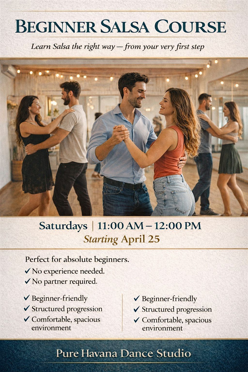 A brand-new Beginner Salsa Course starts at Pure Havana on Saturday, April 25th, and this is your chance to finally learn salsa from scratch in a fun, friendly, confidence-building environment.