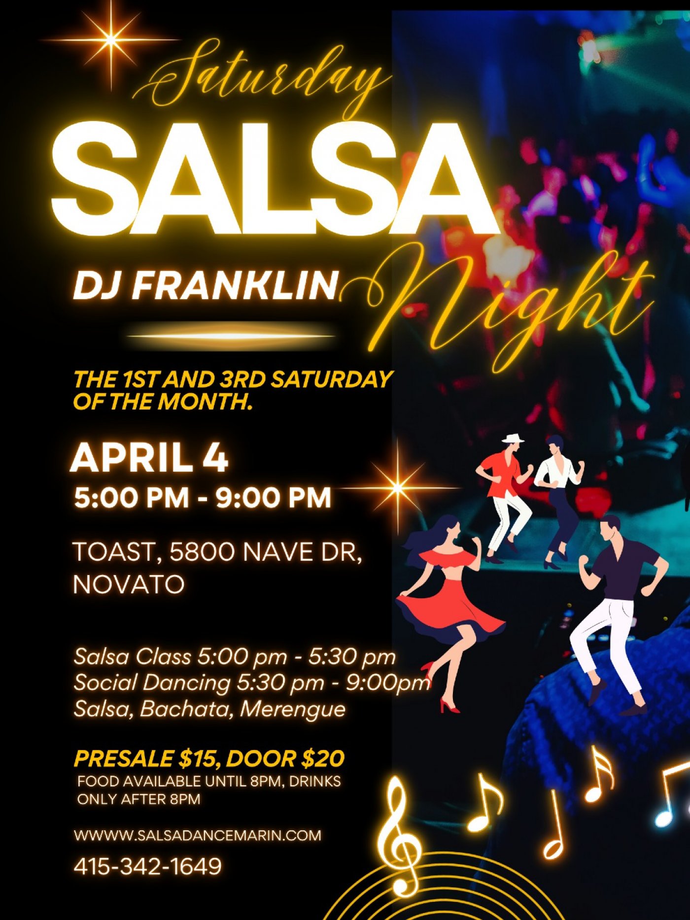 - 5:30 PM – 9:00 PM: Social Dancing (Salsa, Bachata, & Merengue)