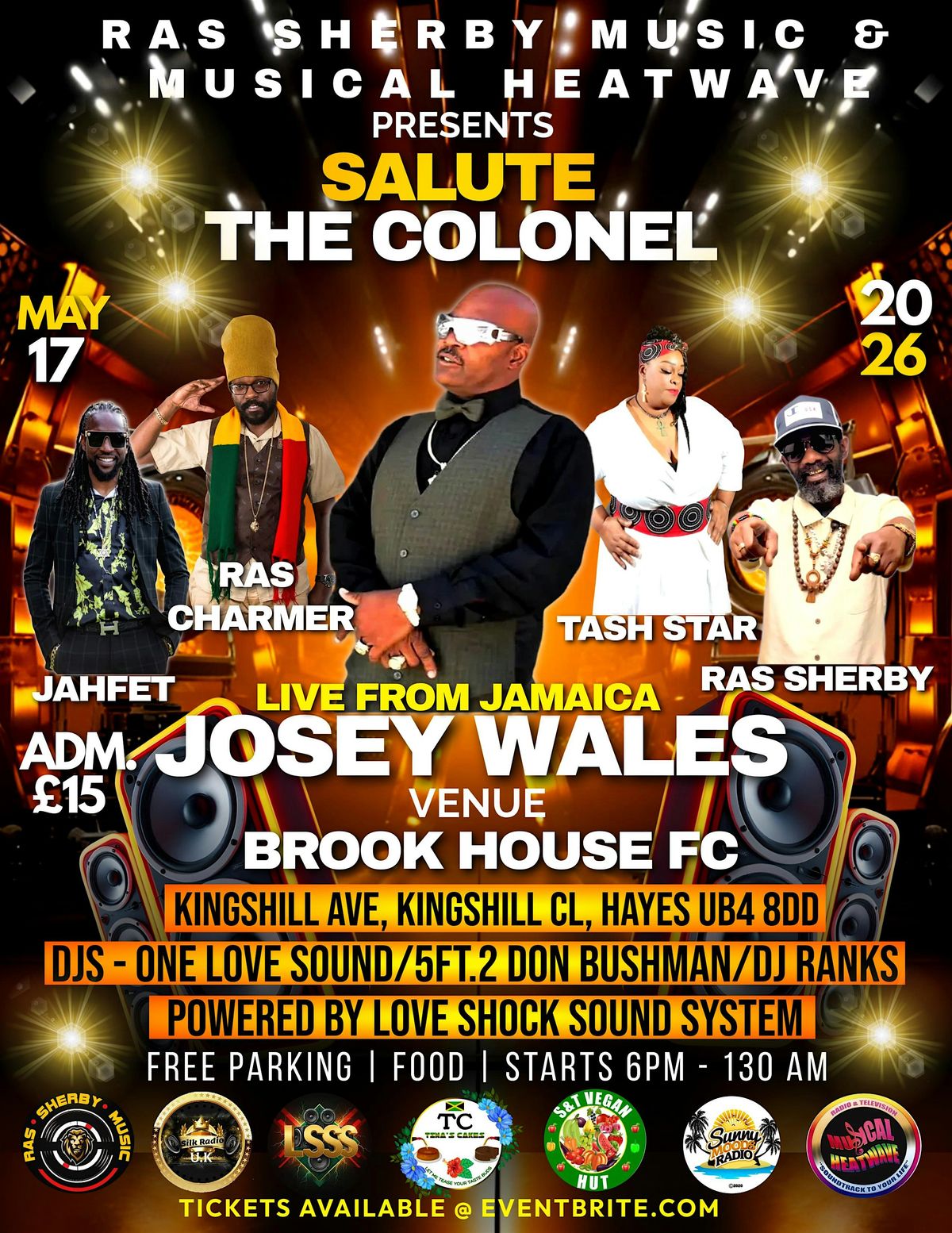 Ras Sherby Music and Musical Heatwave presents a Night called Salute The Colonel Josey Wales Dancehall Legend Live all the way from Jamaica to be held at the Brook House Fooball Club Kingshill Ave, Kingshill Cl, Hayes UB4 8DD on the 17TH OF may 2026 from 7PM to 130AM free parking and Food on sale Adm.£15 best behaviour required