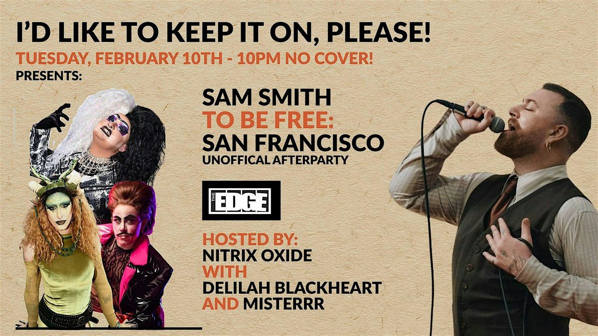 Join us at The Edge for the unoffical afterparty for the opening night of Sam Smith's Castro recidency To Be Free: San Francisco. Hosted by Nitrix Oxide with Delilah Blackheart and Misterrr. Request your favorite music videos and watch performances inspried by Sam Smith all night!