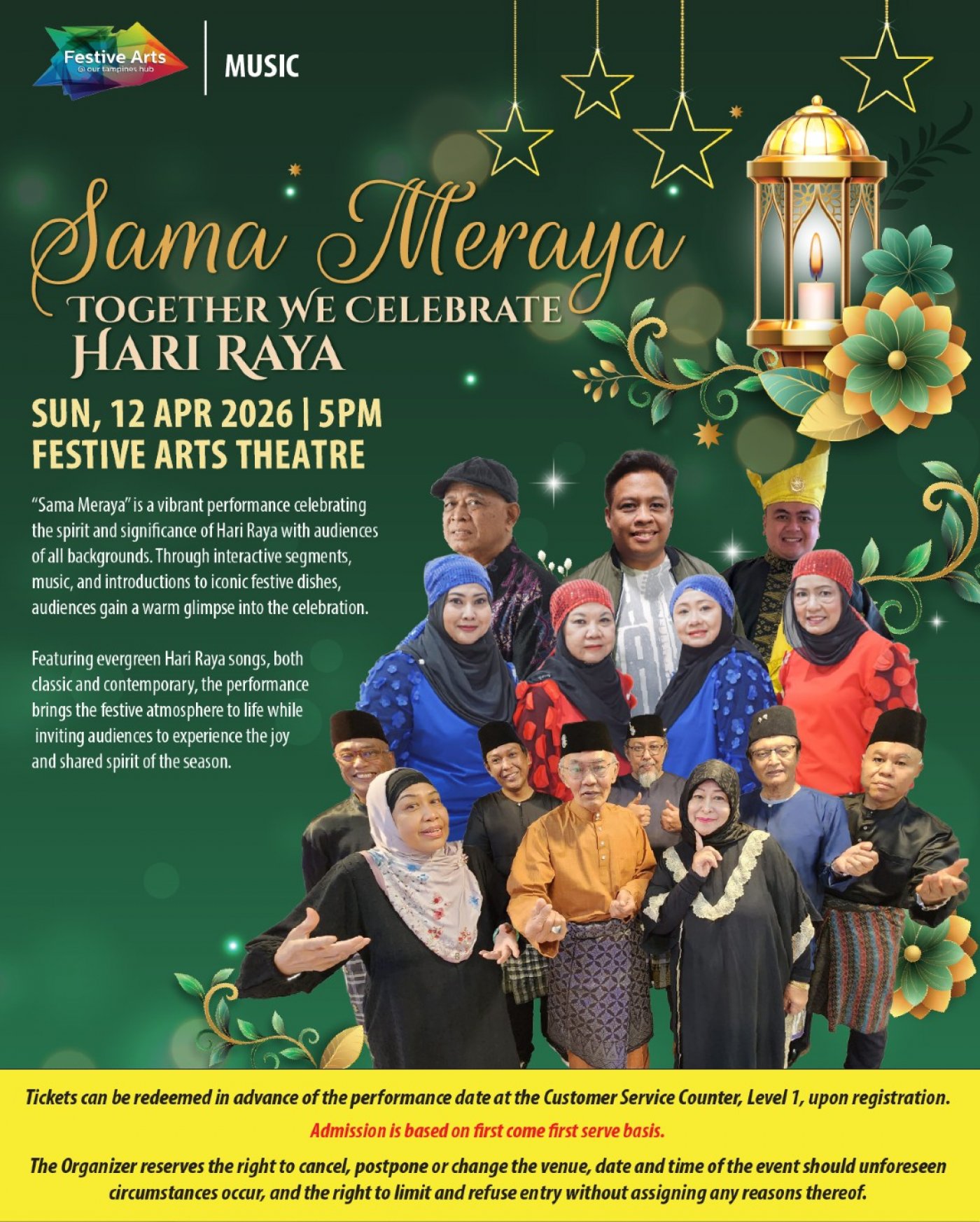 Sama Meraya shares the spirit of Hari Raya with diverse audiences through interactive segments, music, and iconic festive dishes. Featuring classic and contemporary Hari Raya songs, the performance invites audiences to participate in simple customs and preparations, fostering understanding, inclusivity, and shared celebration within our multicultural Tampines community.