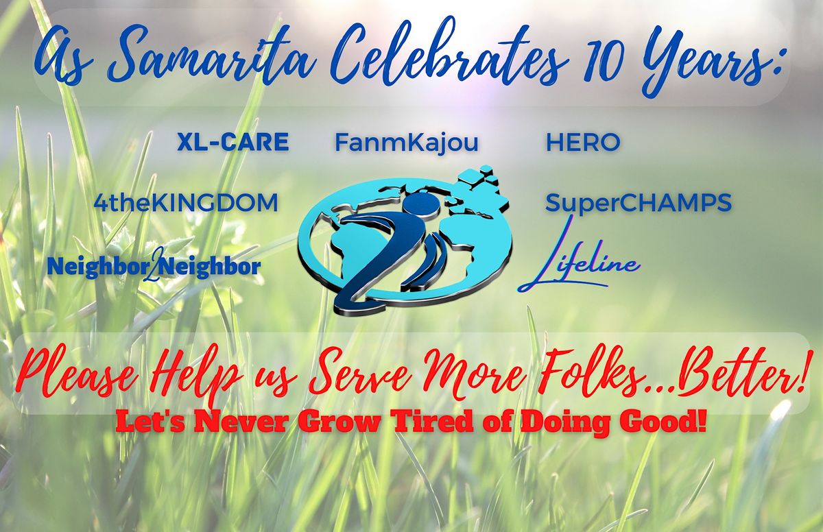 At SAMARITA GLOBAL OUTREACH INC, a 501(c)3 nonprofit organization, we aim to rescue, motivate, educate and empower individuals to excel toward higher standards. After 10 years of operation, we realize the more we do, the more there is to be done!