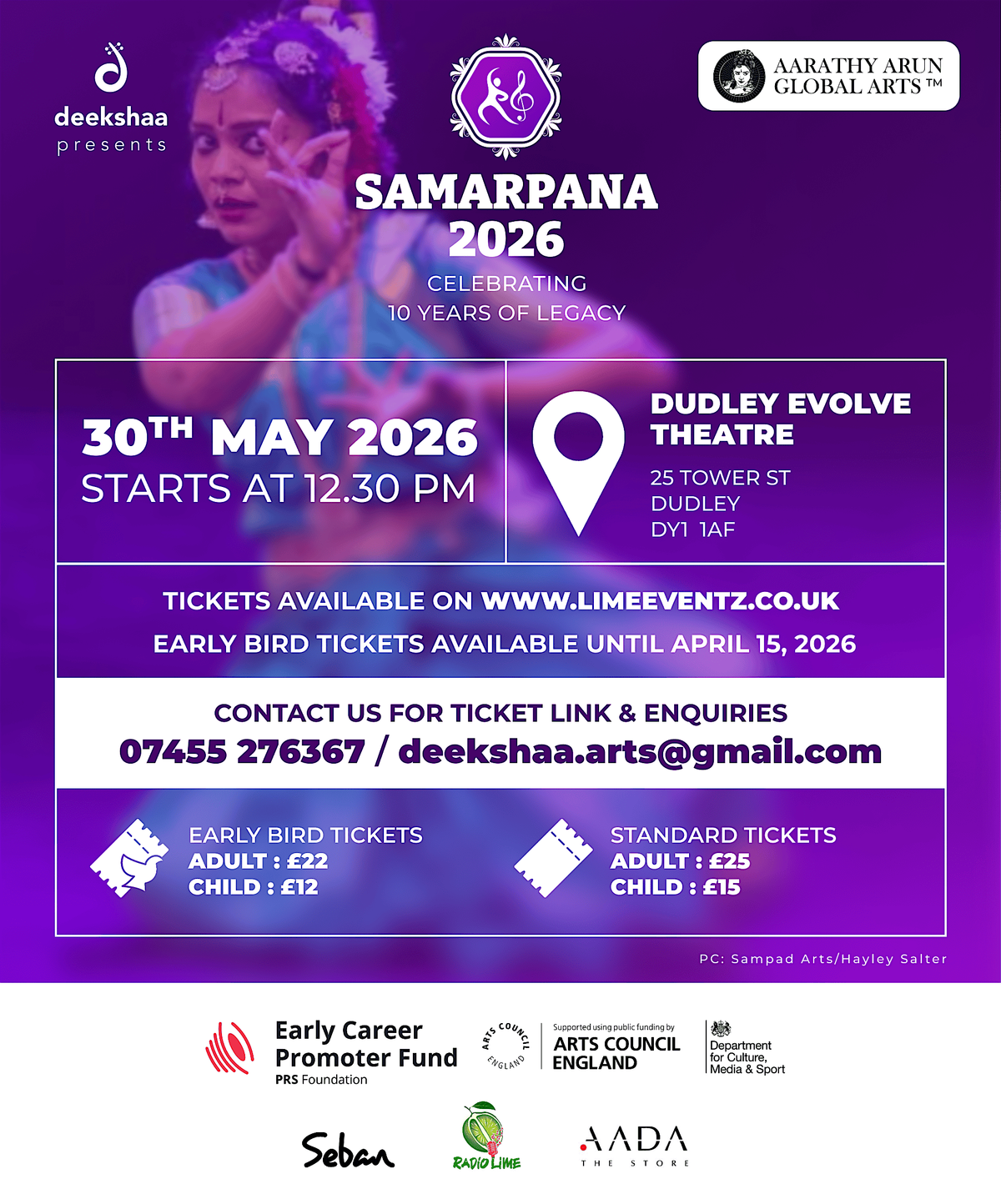 This year’s festival presents an inspiring line-up of performances, bringing together distinguished artists and emerging talents in a rich and immersive cultural experience. The musical segment of Samarpana 2026 is supported by the PRS Foundation’s Early Career Promoter Fund, with additional support from Aarathy Arun Global Arts, Seban & Aada. We are proud to have Radio Lime as our official radio partner.