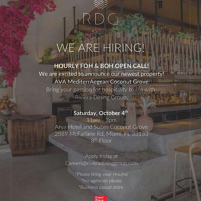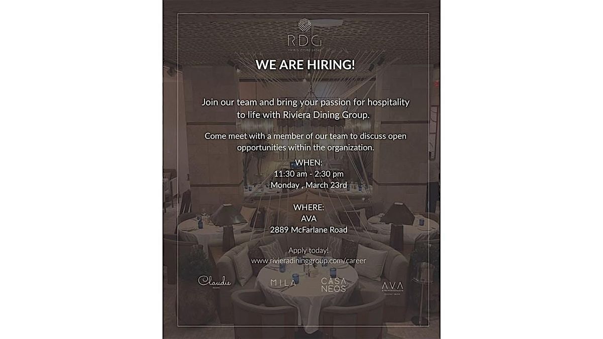 Join the Riviera Dining Group team, home to our flagship MILA, recently named the #1 top-grossing restaurant in the country, for an upcoming hiring event featuring on-site interviews and immediate openings across Front-of-House and Back-of-House positions.