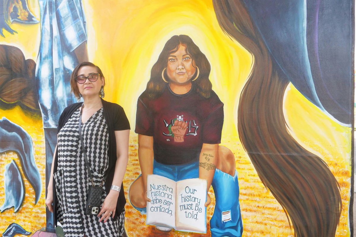 Foto: Berenice Badillo con su mural en Chicano Park. Betty Marín/ACTA. 2023.