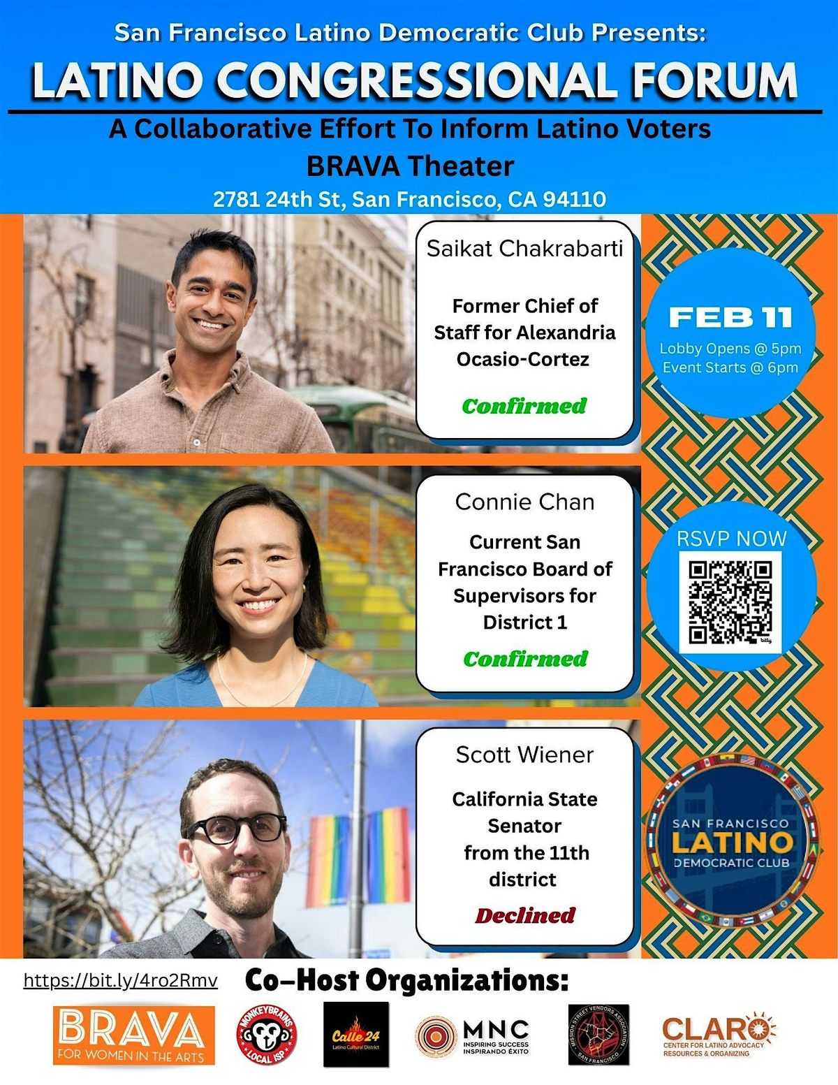 This event is orginiazed in collaboration with servral Latino orginizations in San Francisco. Join us at the Brava Theater Center on February 11, 2026 at 5:00 PM (Pacific Time) for an engaging discussion on important issues affecting the Latino community. This event provides a platform for community members to voice their concerns and engage with local leaders. Don't miss this opportunity to be part of the conversation and make your voice heard. See you there!