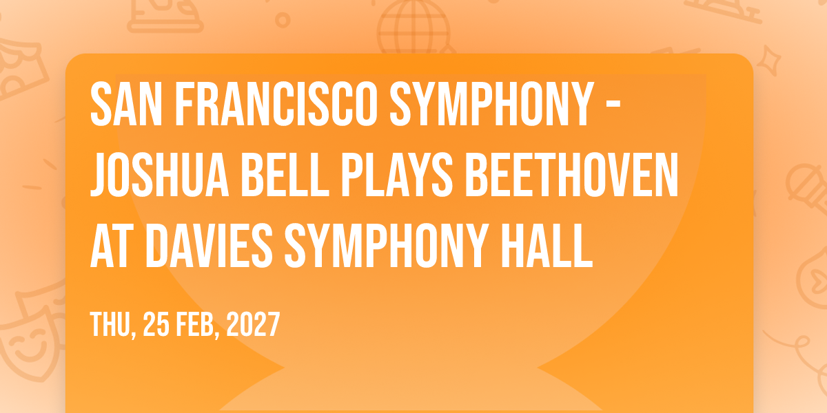 🎉 Welcome to San Francisco Symphony - Joshua Bell Plays Beethoven at Davies Symphony Hall, where the impossible becomes possible and dreams take flight! 🏛️ Join us at Davies Symphony Hall in the heart of San Francisco, CA for an event that will redefine your expectations. 📅 On February 26th, 2027 at 07:30 PM, witness the transformation of space and time into something truly magical. ✨ It's a curated experience combining the best of innovation, entertainment, and community spirit, creating moments that will be remembered for years to come. Whether you're a first-time visitor or a seasoned enthusiast, prepare to be amazed. 🎊 Book now to ensure your place in this unforgettable experience!